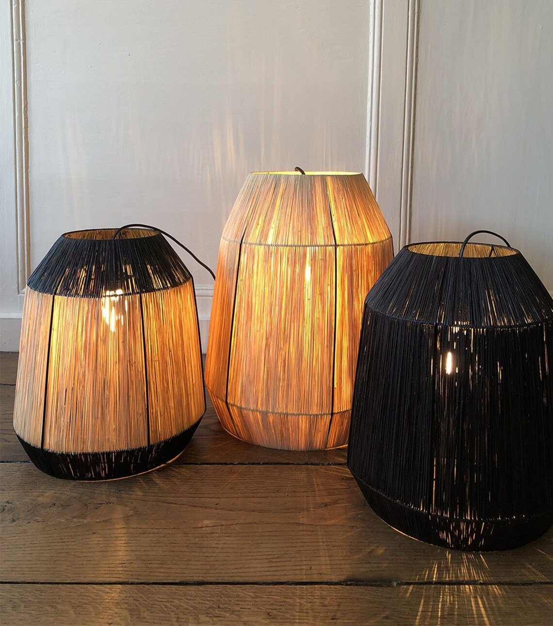 It is a lampshade woven with natural raffia and raffia tinted with licorice color.