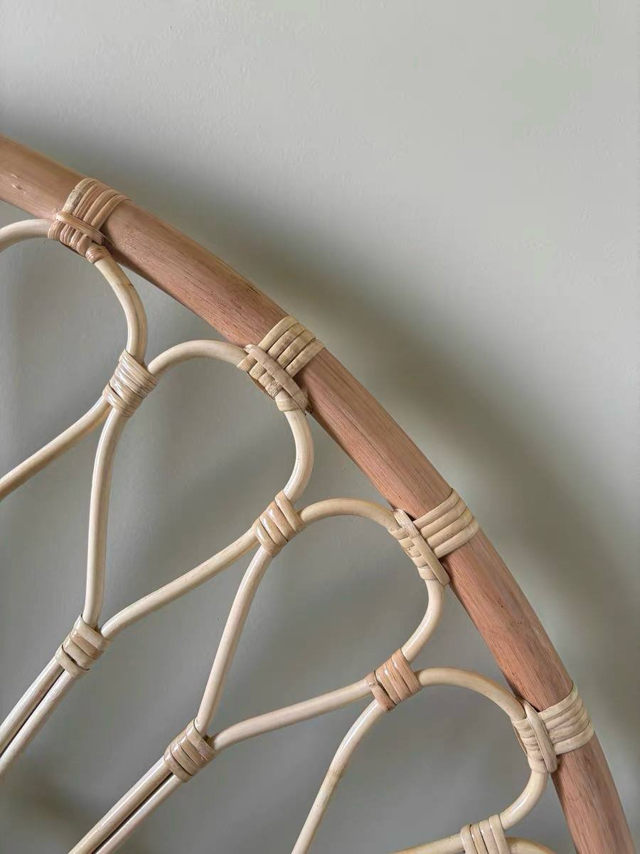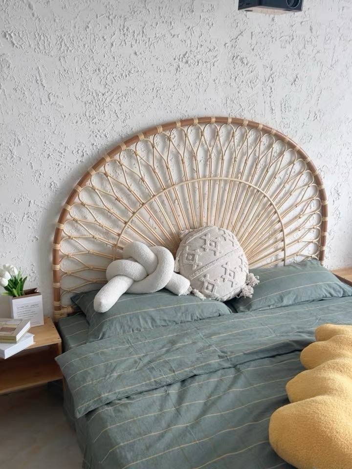 Bring a touch of bohemian charm to your bedroom with this stunning natural rattan headboard, handcrafted with care. Inspired by floral shapes, this headboard resembles a blossoming flower, adding softness and elegance to your space. Its unique artisanal design and clean lines make it a perfect centerpiece for lovers of natural and refined style.