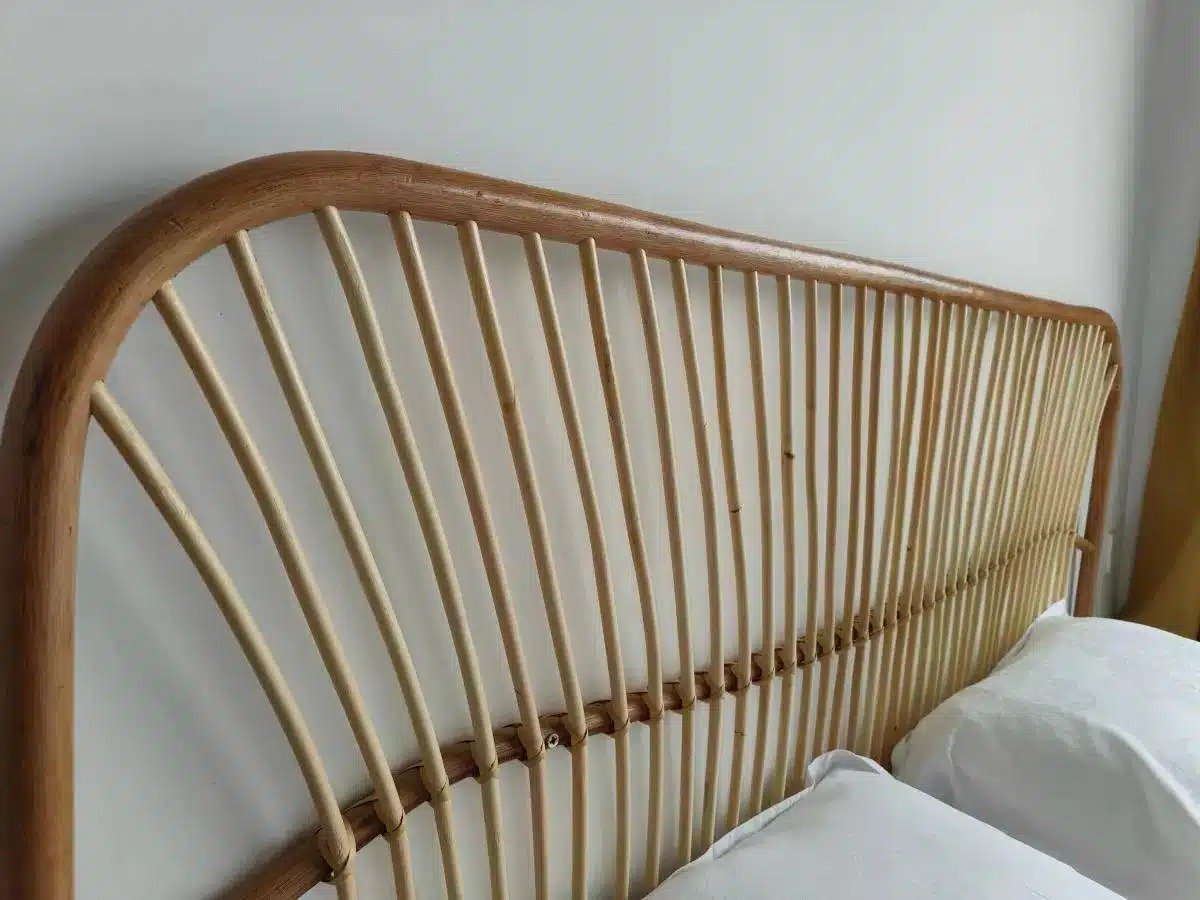The “Lumina” natural rattan headboard is designed to bring a relaxing and natural atmosphere to your bedroom. With its rounded frame and vertical rattan slats, this headboard perfectly combines traditional craftsmanship with contemporary aesthetics, offering both support and style to your resting space.
